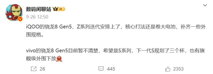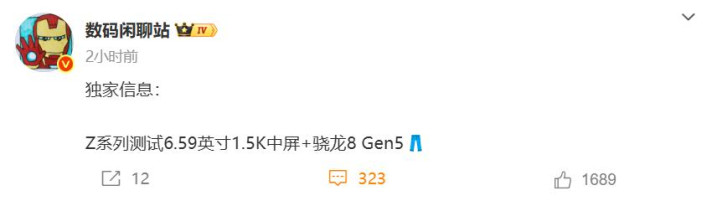 博主数码闲聊站近期爆料,iqoo z系列在测试6.59英寸1.5k中屏手机,预计是下一代的iqoo z11 Turbo,核心打法还是性能和大电池,处理器将会采用骁龙8Gen 5,性能跑分在三百万以上,有旗舰水准。